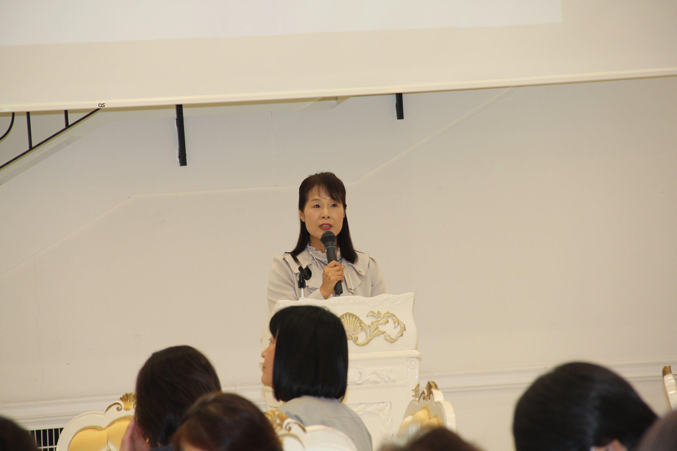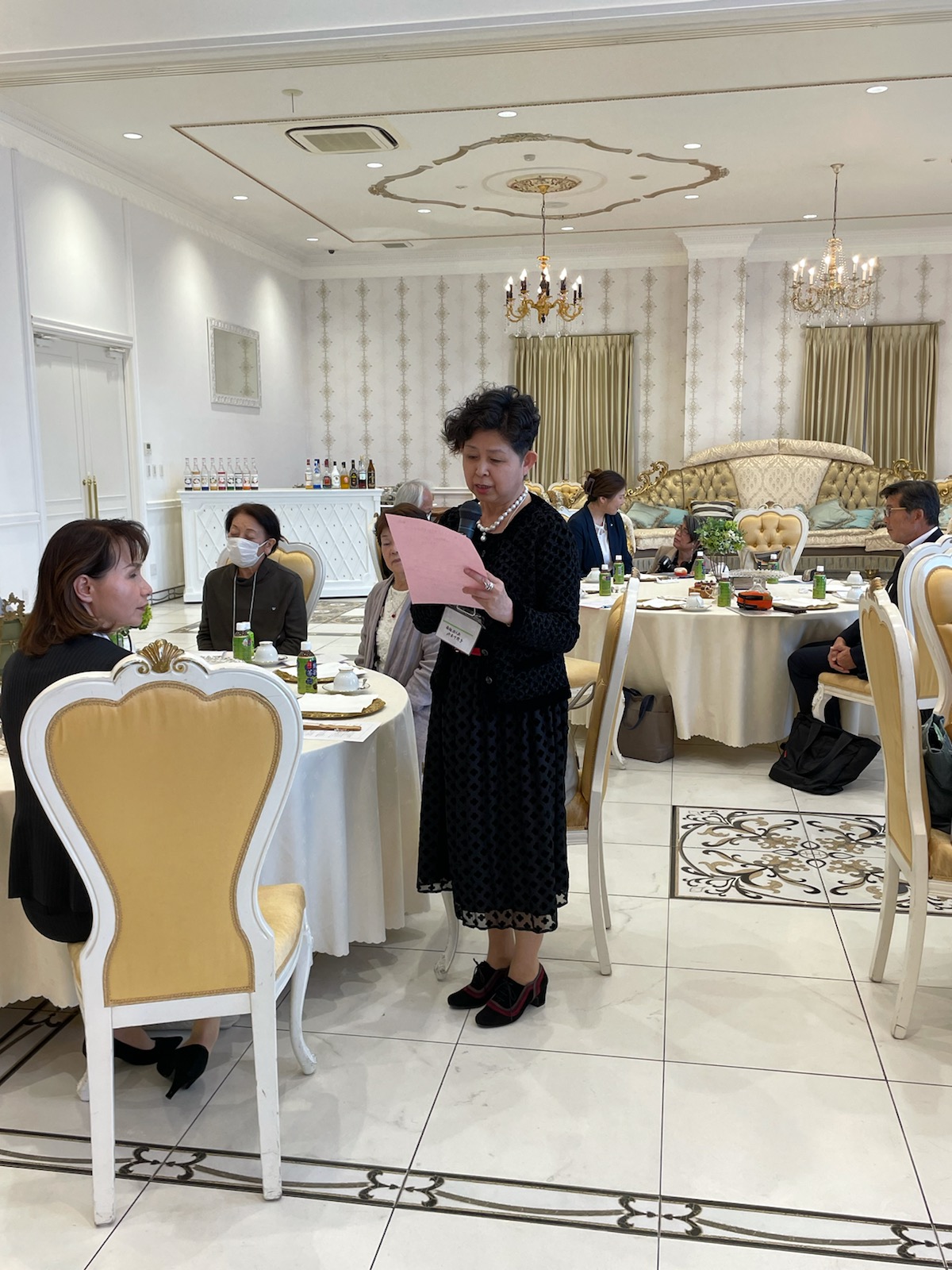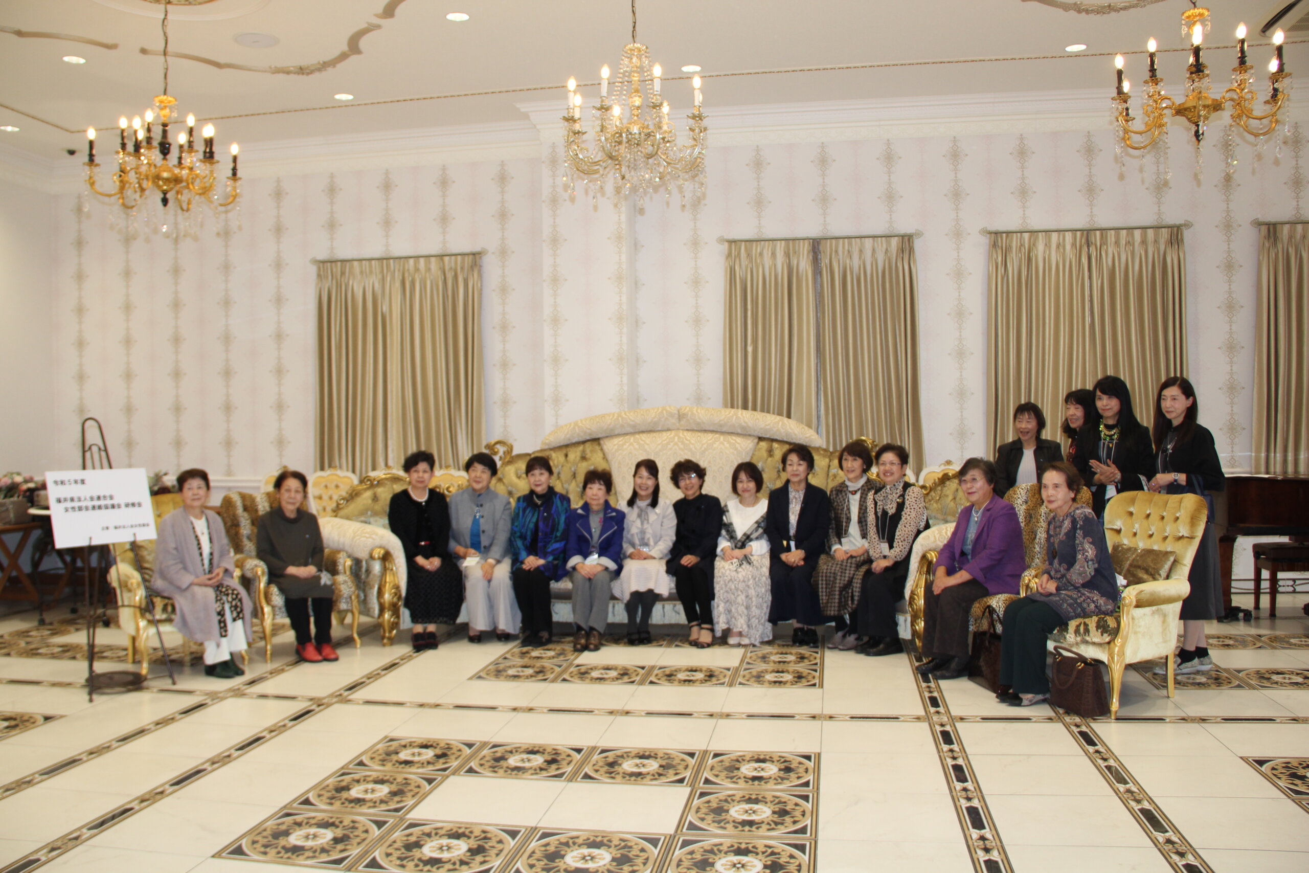 会場は、ロイヤルグレース大聖堂のロイヤル会場で、ホワイトカラー一色のすてきなウエディング会場でした。各単位会部会長(南越は宇野純子部会長)が活動を発表した後、総勢96名が各テーブルに分かれての交流会「魅力ある女性部会にするために」をテーマにディスカッションしました。どのテーブルも活発な意見の交換が行われたようで、会場が話し声や笑い声でとてもにぎやかで、会員同士仲良くなれたり、今後の活動に生かせる、実りある研修会となりました。